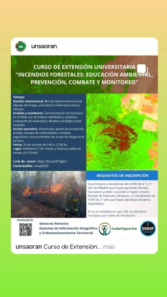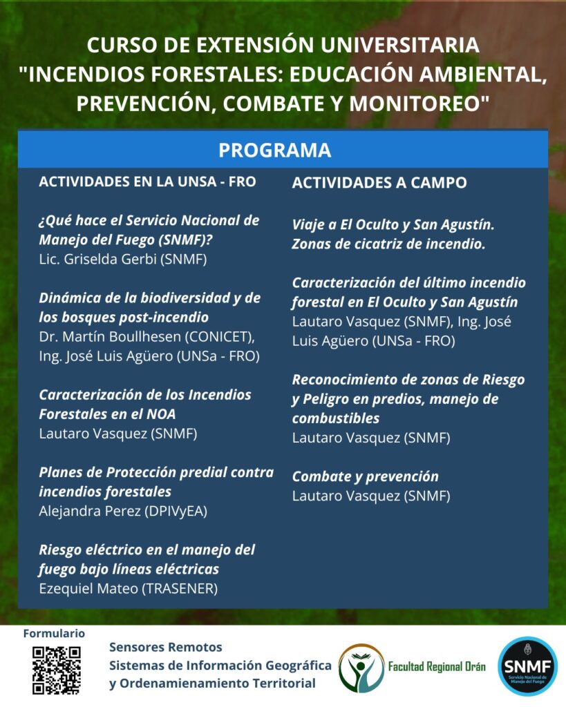 El día Jueves 23 de Octubre se realizó en la UNSA sede Orán el Curso de Extensión, para estudiantes de las carreras afines a la problemática. La jornada consistió en clases a cargo de especialistas y una salida a campo en zonas quemadas recientemente.